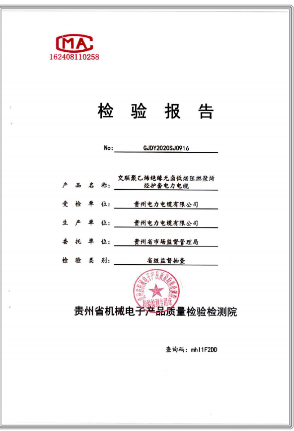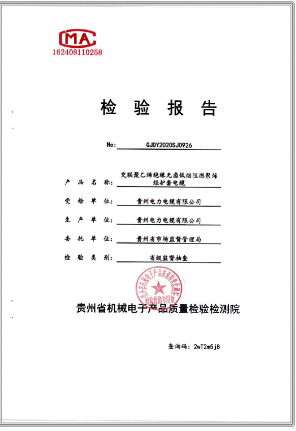 交聯(lián)聚乙烯絕緣無鹵低煙阻燃聚烯烴護(hù)套電纜 檢驗(yàn)報(bào)告