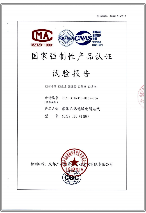 聚氯乙烯乙烯絕緣電纜電線 國(guó)家強(qiáng)制性產(chǎn)品試驗(yàn)認(rèn)證報(bào)告