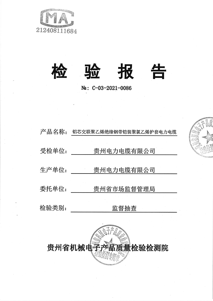 鋁芯交聯(lián)聚乙烯絕緣鋼帶鎧裝聚氯乙烯護(hù)套電力電纜 檢驗(yàn)報(bào)告